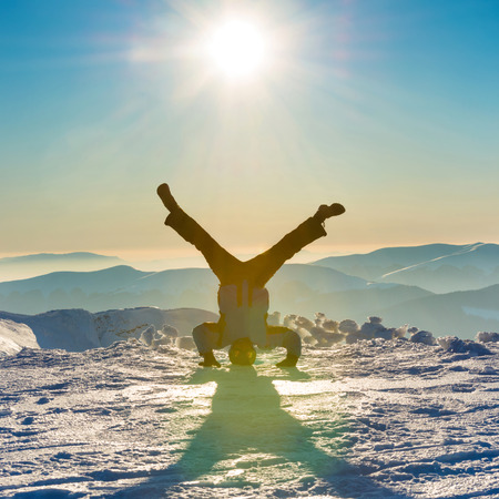 Silhouette of a man doing acrobatic exercises in nature in Baikal