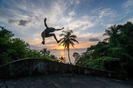 Silhouette of happy man with jumping very high from the hill with a coconut palm trees with a sea on a horizon in a sunset. Vacation and travel concept on a island. Beautiful sunsets on a Samui island.