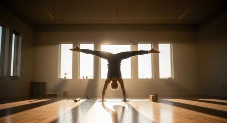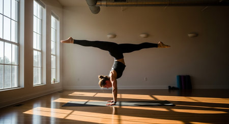shot of a woman performing a yoga handstand, created with generative ai