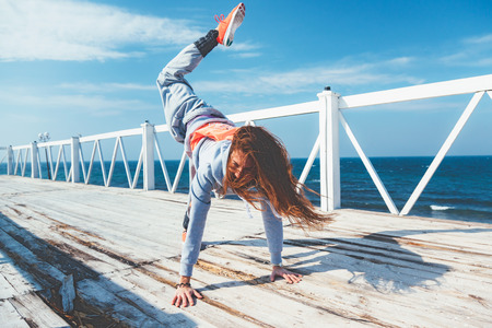 Fitness sport girl in fashion sportswear doing fitness exercise in the street. Hip hop dancer, outdoor sports.