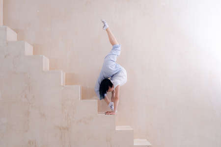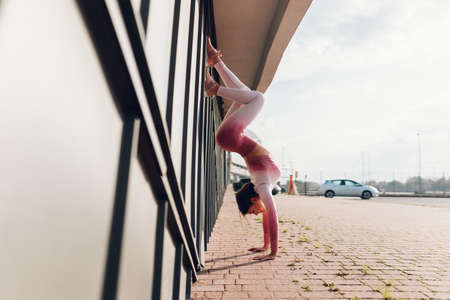 Young woman acrobat on handstand performs twine against the wall outdoors