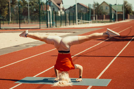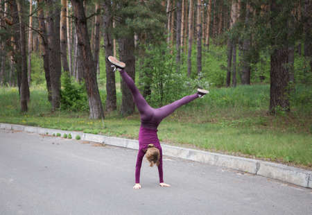 young unrecognizable slender girl in sportswear stands upside down doing an acrobatic coup. gymnastic exercises. Activity, cheerfulness, balance. healthy active lifestyle
