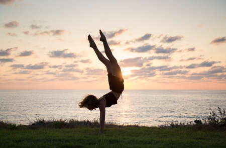young slender woman who does a handstand at sunset on the sea coast, beautiful silhouette. the concept of cheerfulness, sports education, a healthy lifestyle. The girl trains with pleasure.