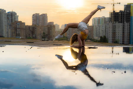 Flexible female gymnast doing handstand and calisthenic with reflection in the water on cityscape background during dramatic sunset