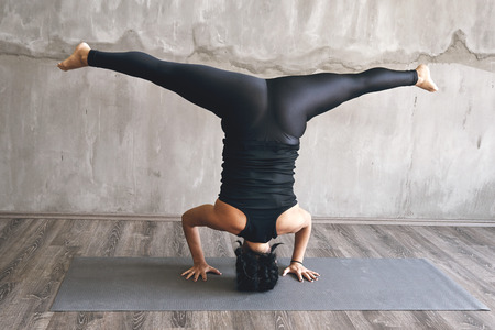 Young strong female do complex of stretching yoga asanas in loft style class. Shirshasana position. Handstand.