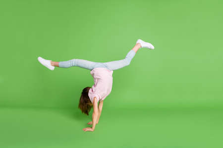 Full length profile side photo of young girl stand on hands gymnastics sport isolated over green color background