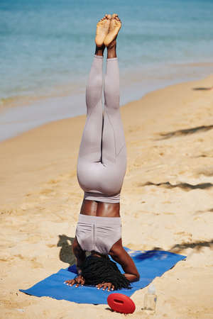 Sporty young Black woman performing headstand on yoga mat on the beach, view from the back