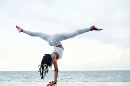 African American woman balancing on hands doing handstand on white sandy beach waters edge. Fitness, athleticism, vitality, outdoor, recreation, wellness, energetic