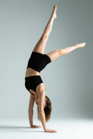 Girl with beautiful figure doing handstand. Slim sporty woman practicing balance pose