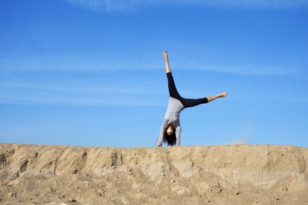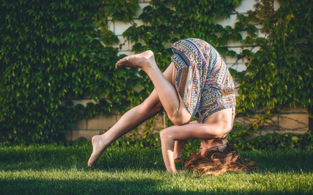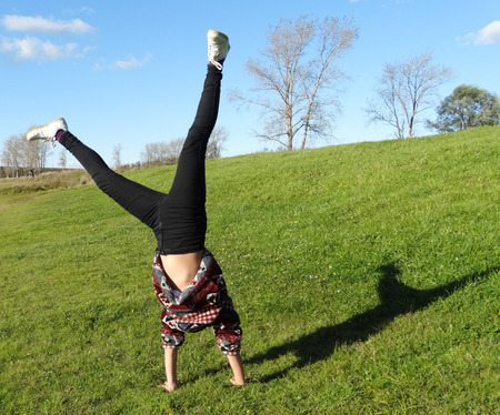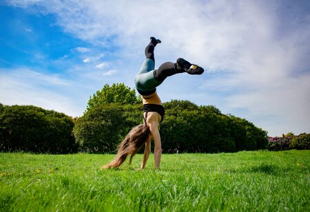 Athletic girl doing stretching exercise and handstand, spring time