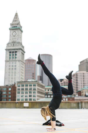 Woman doing handstand on rooftop, Boston, Massachusetts, USA