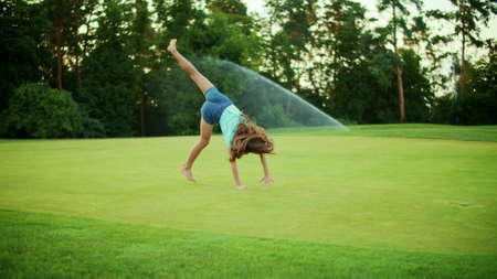 Girl on the grass on a Sunny day tumbling gymnastic exercises doing