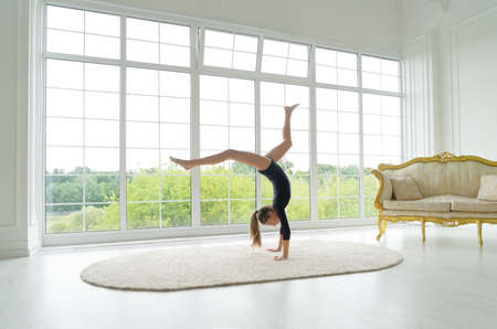 Teenage girl gymnast in sport bodysuit makes gymnastics and stretching routine by raising legs up and standing on hands in room with big windows