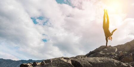 Athletic slim woman exercising balance in handstand in nature