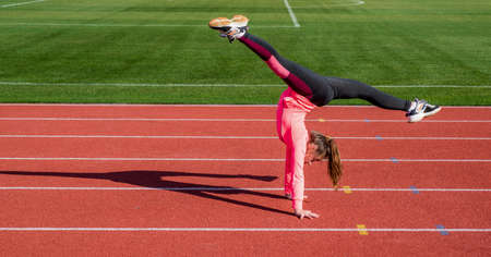 workout on fresh air. confident gymnast with flexible body. gymnastics. teen girl do trick on stadium. kid in sportswear. child do coups exercise on racing track. healthy childhood. Energy inside