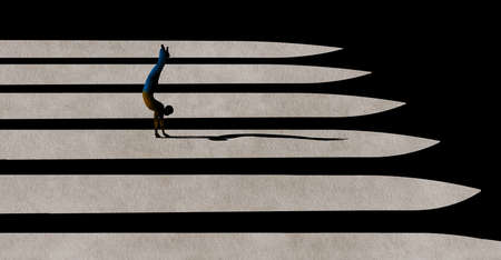 A man does a handstand in the light and shadows of a courtyard. This is a 3-d illustration