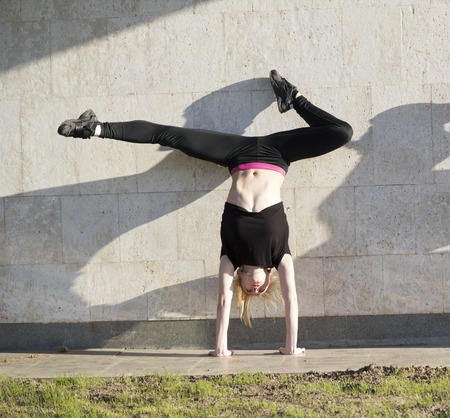 young caucasian beautiful woman with a tight body doing a handstand on the street
