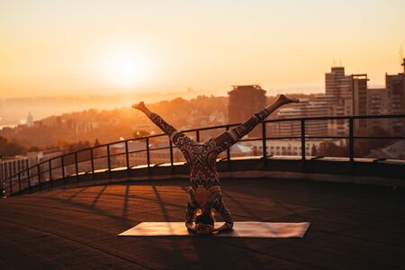 Woman doing yoga on the roof of a skyscraper in big city. Sunset