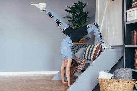 Flexible girl practice stretching and handstand at home. concept of quarantine time during self isolation