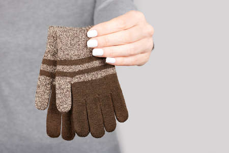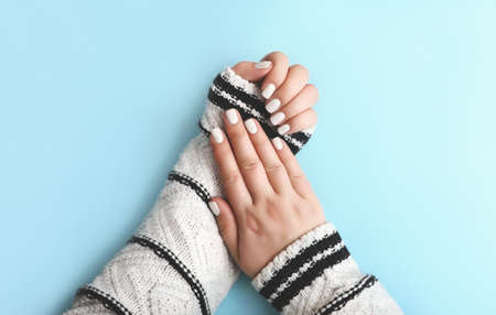 Female hands with beautiful manicure. Female hands in knitted gloves.