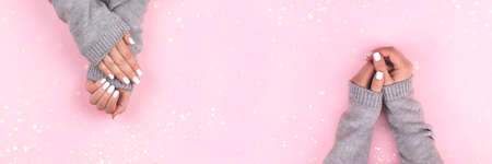 Female hands in gray knitted sweater with beautiful manicure - white nails on pink background with blurred lights bokeh. Panoramic banner with copy space. Nail care concept
