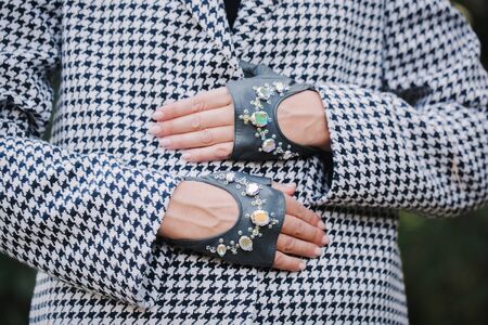 Beautiful gray gloves with cutouts and rhinestones