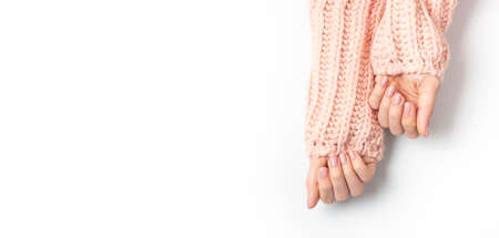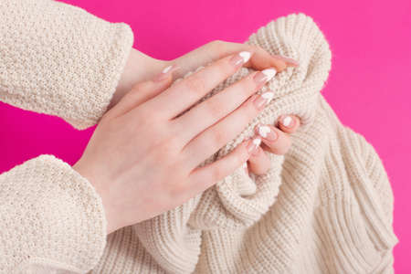 Stylish beautiful gentle manicure. Hands of young woman in pink knitted sweater on white background top view flat lay. Natural nails gel polish self-care beauty and fashion. Nail care Beauty salon.