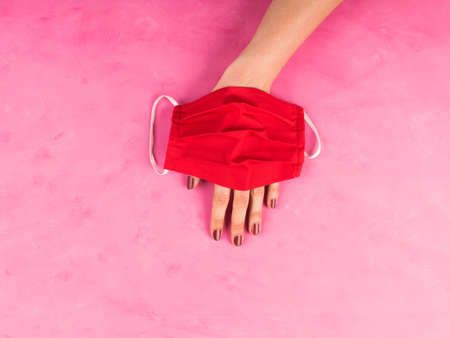 Hand made red face mask in femle hand on pink background. New normal fashion in times of Coronavirus Covid-19
