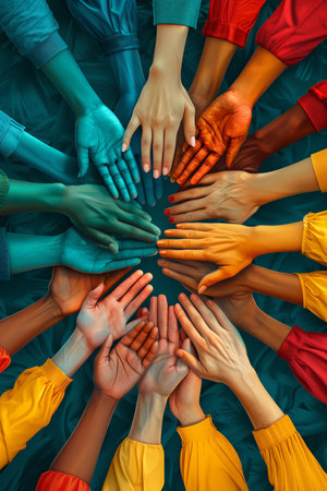 A close-up of various hands united, symbolizing diversity, teamwork, and solidarity among people.