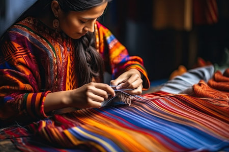 female weaver at work on traditional loom, surrounded by colorful threads, native american heritage