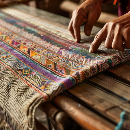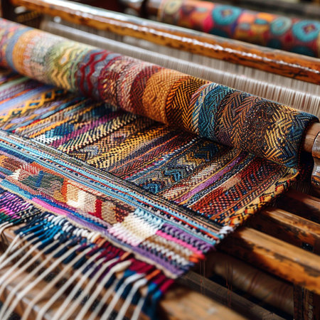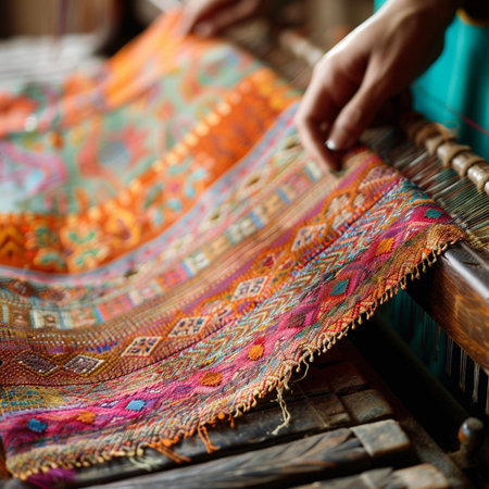This image captures the intricate weaving process on a traditional loom, highlighting the artistry and craftsmanship of textile creation. The patterned fabric showcases the rich cultural heritage behind this timeless art form.