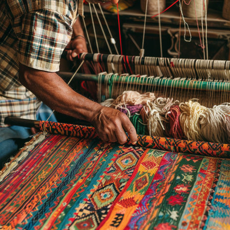 An artisan skillfully weaves a vibrant tapestry in a warm, inviting workshop. The craftsmanship showcases intricate patterns and bright colors, capturing the essence of traditional art.