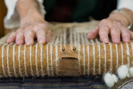 With decades of experience etched into their hands, a skilled artisan meticulously works a traditional wooden loom.