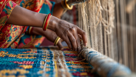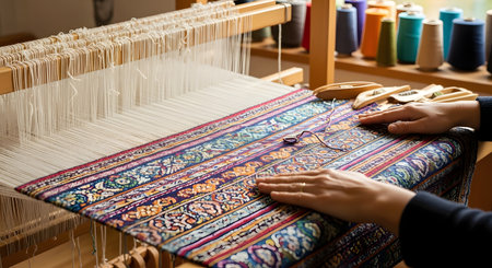 Skilled hands work meticulously at a loom, creating a vibrant textile. Threads of various colors blend together, showcasing artistry and craftsmanship in a cozy workshop.
