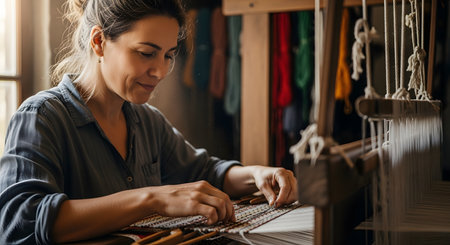 Weaving loom fabric textile artistry craftsmanship hands colorful strong independent woman side hustle High resolution AI generated