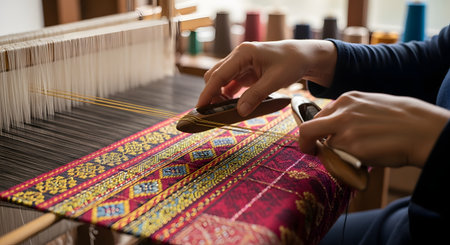 Artisan's hands skillfully manipulate threads on a weaving loom, showcasing craftsmanship and dedication to traditional techniques.