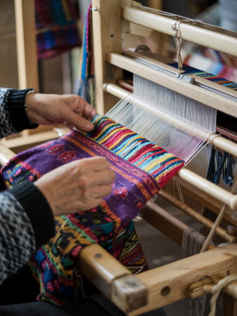 Hands of an elderly artisan skillfully weave a vibrant textile, showing intricate patterns and colors in a warm, inviting space full of creativity.