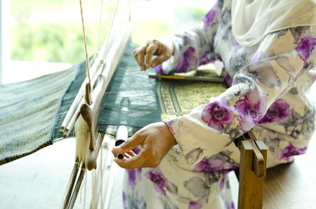 A woman is weaving a piece of cloth with a wooden stick. Concept of patience and dedication as the woman carefully weaves the thread. The wooden stick she is using to guide the thread adds a rustic