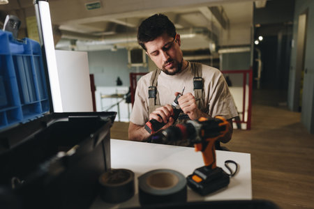 Man doing renovation work at home, drilling with a screwdriver. Group of repair tools on wooden white background with copy space. New house furniture concept. Repair maintenance concept.