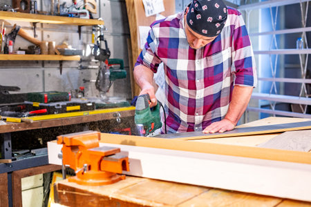 mature joiner working with miter saw in carpentry workshop
