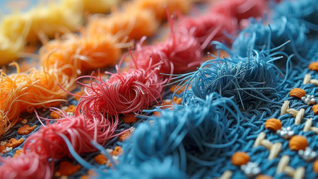 Colorful threads close-up: intricate textile art with blue, pink, and orange fibers. That the image is generated using AI.