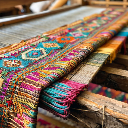 Hands expertly weave vibrant threads into a beautiful textile at a cozy workshop. The colorful rug displays intricate geometric designs, showcasing the artist's skill and dedication.