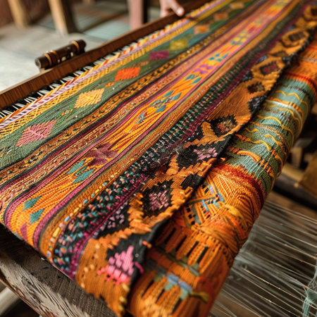 Skilled artisan weaves threads into a colorful fabric, showcasing craftsmanship and dedication in a cozy workshop filled with tools and materials.