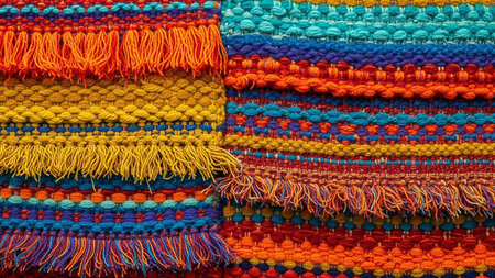 Colorful woven textile with intricate patterns and tassels. That the image is generated using AI.