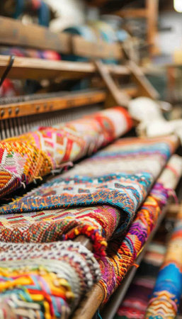 Artisan weaving colorful threads on traditional loom, innovative production