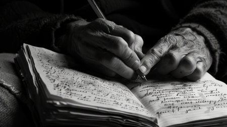 Trembling hands trying to write in a notebook, with illegible letters generative ai