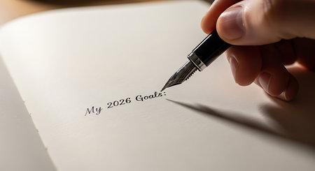 Close up view of hand holding fountain pen, writing 'My 2026 Goals' on blank journal page, symbolizing personal planning and aspiration for future year. Soft focus. Warm light.