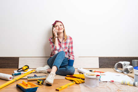 Dreamy girl talking on smartphone at home. Apartment remodeling and house interior renovation concept with copy space. Young attractive woman in red checkered shirt and jeans sitting on floor.