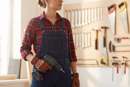 A professional female carpenter wearing a red plaid shirt and blue denim overalls stands in a bright workshop while holding a cordless power drill with brown leather gloves on her hands.