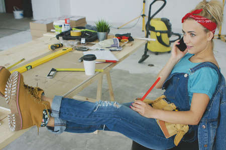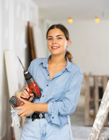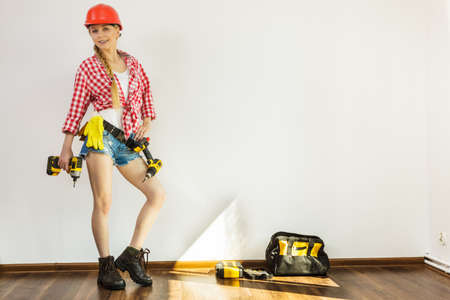 Young woman with toolbelt using driil and some power tools for her work at home. Girl working at flat remodeling. Building, repair and renovation.
